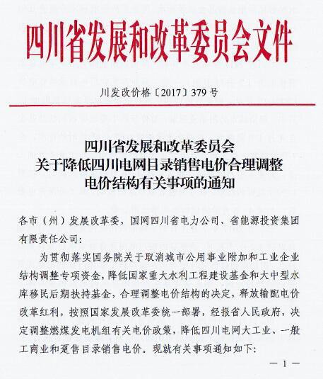 近日,四川省發 改 委發布了《四川省發展和改革委員會關于降低四川電網目錄銷售電價合理調整電價結構有關事項的通知》(以下簡稱“通知”)。通知指出,自2017年7月1日起,取消向燃煤發電企業征收工業企業結構調整專項資金,降低重大水利工程建設基金和中大型水庫移民后期扶持基金征收標準,降低后的征收標準分別為0.52分/千瓦時、0.62分/千瓦時。燃煤發電機組有關電價政策另行明確。具體情況如下: