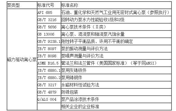 六、泵的設(shè)計、制造、檢驗應(yīng)符合有關(guān)標(biāo)準(zhǔn)、規(guī)范的規(guī)定,常用磁力驅(qū)動離心泵的類型、標(biāo)準(zhǔn)代號及標(biāo)準(zhǔn)名稱見表1。