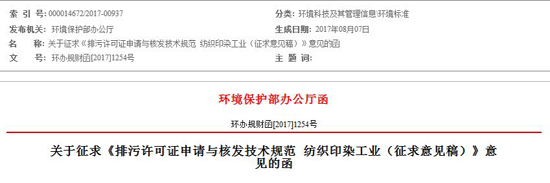 關(guān)于征求《排污許可證申請(qǐng)與核發(fā)技術(shù)規(guī)范紡織印染工業(yè)(征求意見稿)》意見的函