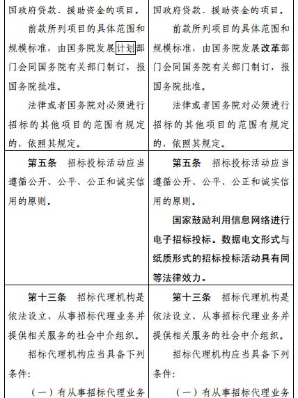 二、第五條增加一款,作為第二款:“國家鼓勵利用信息網絡進行電子招標投標。數據電文形式與紙質形式的招標投標活動具有同等法律效力。”