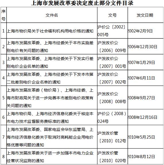 近日,上海市發改 委發布了《上海市發 改委關于廢止一批文件的通知》,決定廢止《上海市物價局關于社會福利機構用電價格的通知》(滬價公〔2002〕005號)等8件文件。如下: