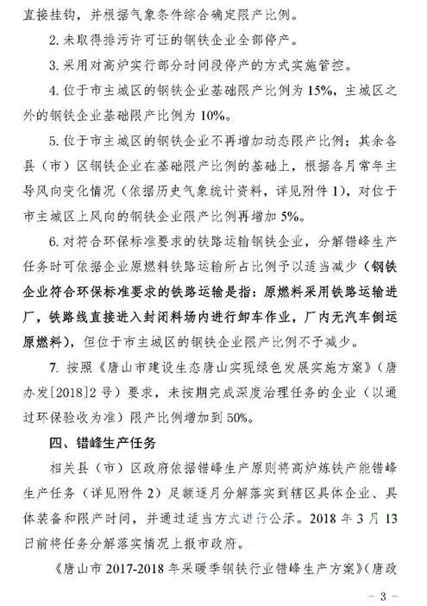 日前,《唐山市鋼鐵行業2018年非采暖季錯峰生產方案》經市政府同意,已正式下發。方案中明確了錯峰生產依據和原則,綜合考慮唐山市環境空氣質量現狀、鋼鐵企業所處區域和氣象條件,對全市鋼鐵企業實施非采暖季精準化、差異化錯峰生產。全文如下: