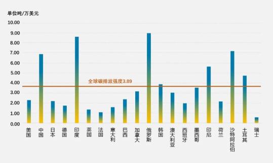 我國碳排放總量在2008年首度超過美國,2019年已接近美國的2倍,占全球總碳排放的27.2%,超過美國和歐盟的總和。人均碳排放量已超過歐盟,排名全球第二。如延續(xù)原有發(fā)展模式,將在短期內超過美國。2019年,碳排放強度為6.88噸/萬美元,高出全球平均43%。